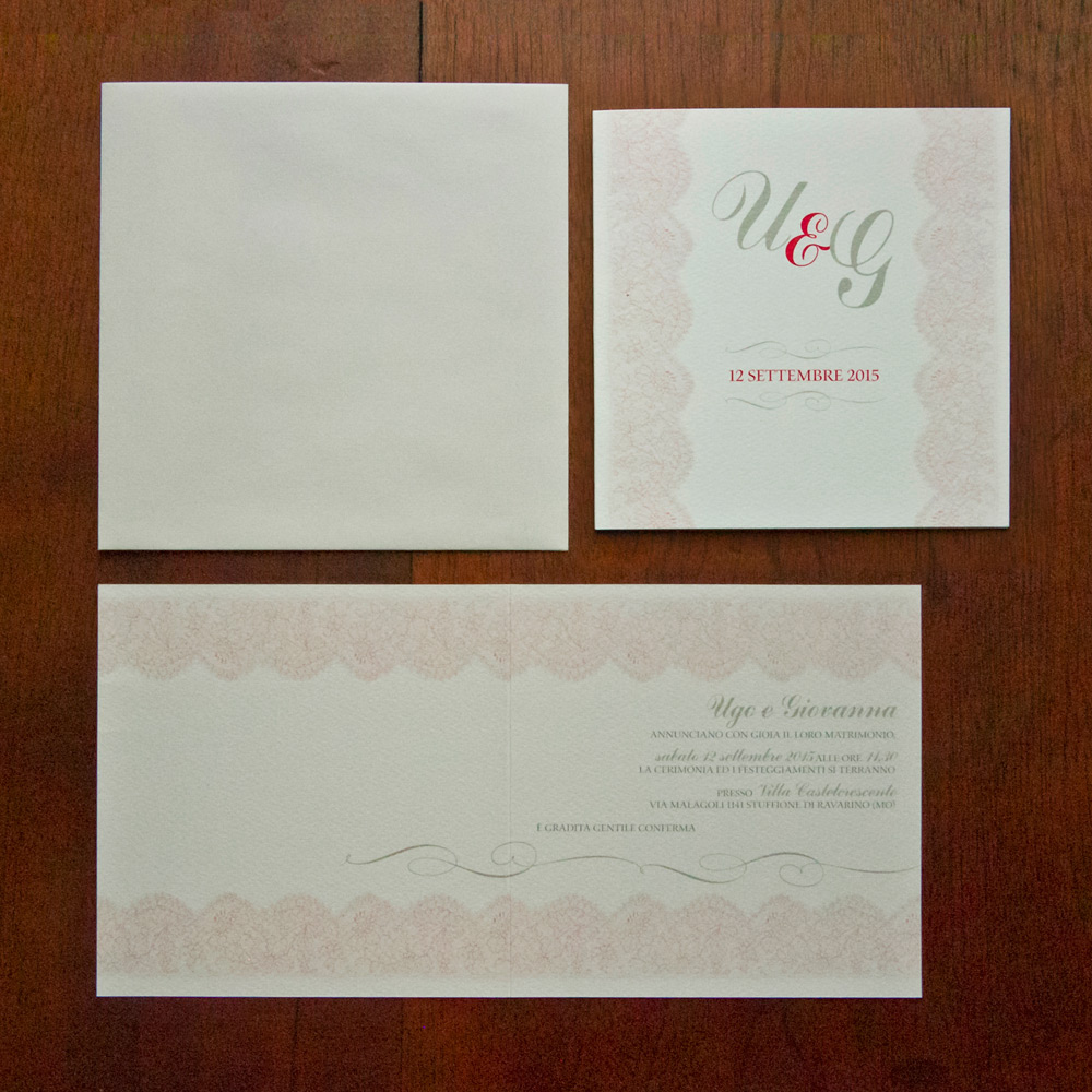 Questo tipo di partecipazione può essere personalizzata in tutte le sue variabili. Come vedrete dal modello e dalla sua descrizione ne abbiamo realizzato 2 modelli che si aprono a libro e una a un foglio solo. Ma la scelta dei pizzi dei fiocchi e della carta, nonché del font viene fatta sempre insieme al cliente. Siete sempre voi a decidere i dettagli dei vostri inviti.