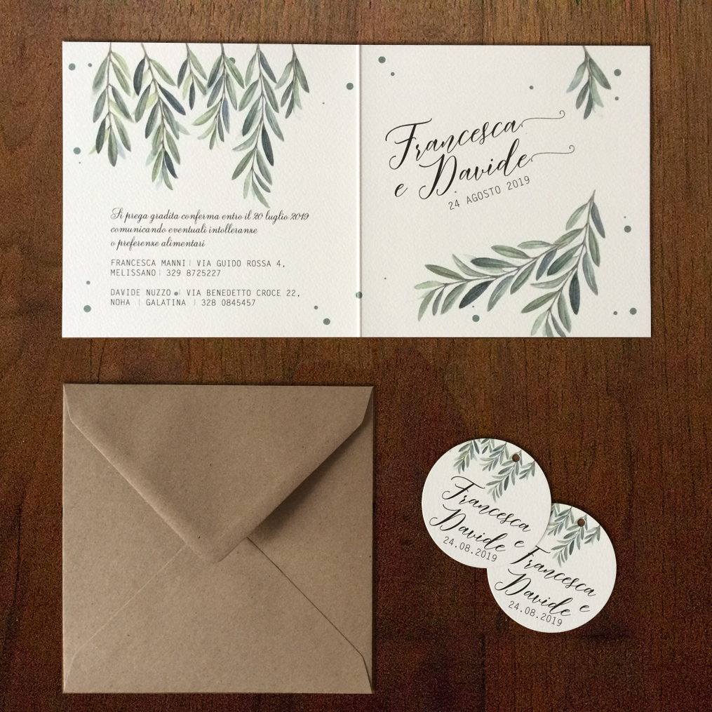 La grafica di questa partecipazione di nozze tema ulivo è romantica e elegante per chi ha scelto una location rustica, ma anche non vuole rinunciare ad un tocco di eleganza. L’ulivo è una pianta meravigliosa che darà un’impronta unica ai vostri inviti. Rendeteli unici e raccontate la vostra storia!