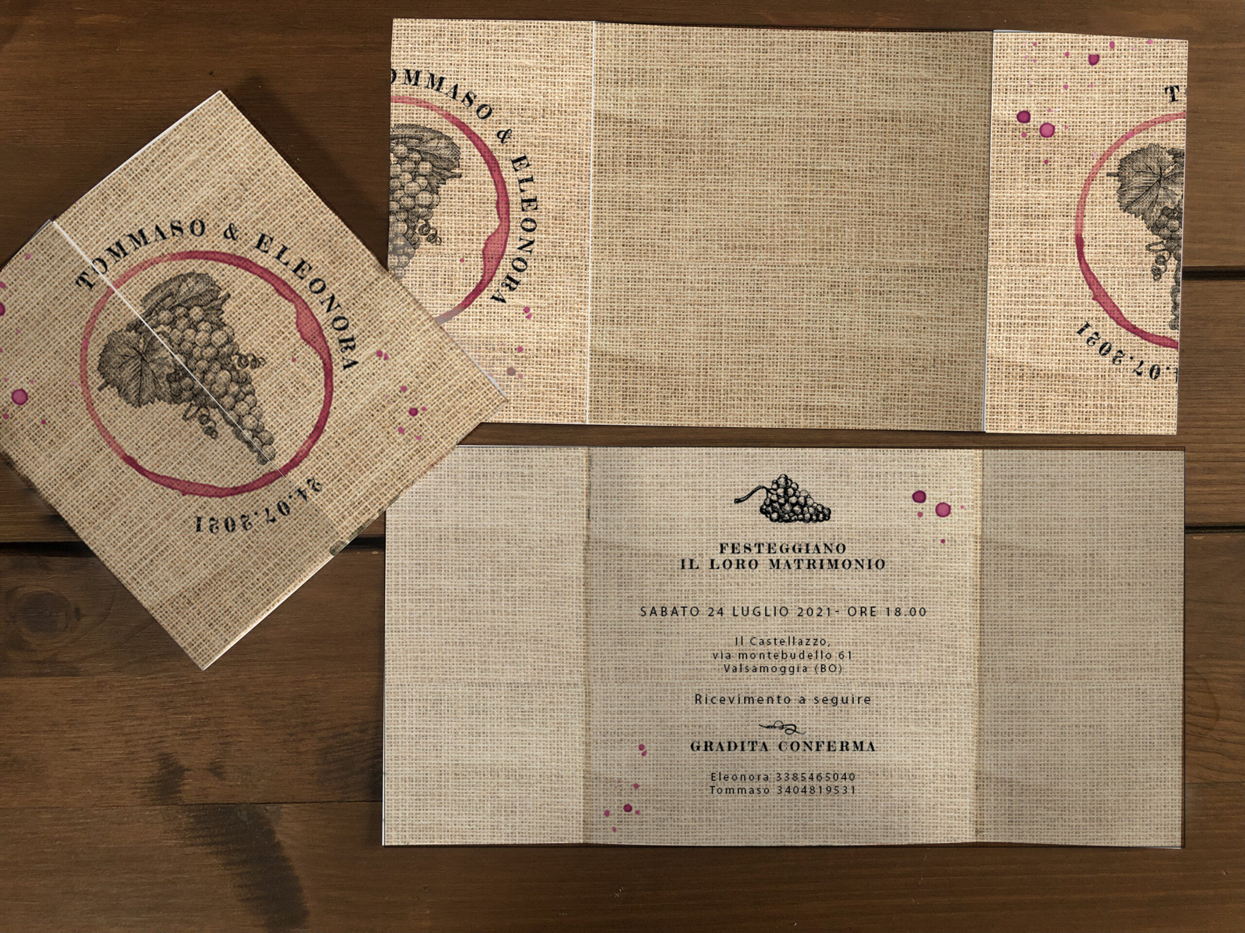 La grafica di questa partecipazione di nozze a tema vino è una novità rustica ma molto giovane, con una grafica ricercata e raffinata. È stata riprodotta una trama che ricorda la juta e ci riporta ai sottobicchieri di sughero e alle botti di vino. Una scritta che sembra stampata e impressa sulla stoffa, colori caldi e avvolgenti. Se il vostro tema è il vino la partecipazione adatta a voi potrebbe essere questa.