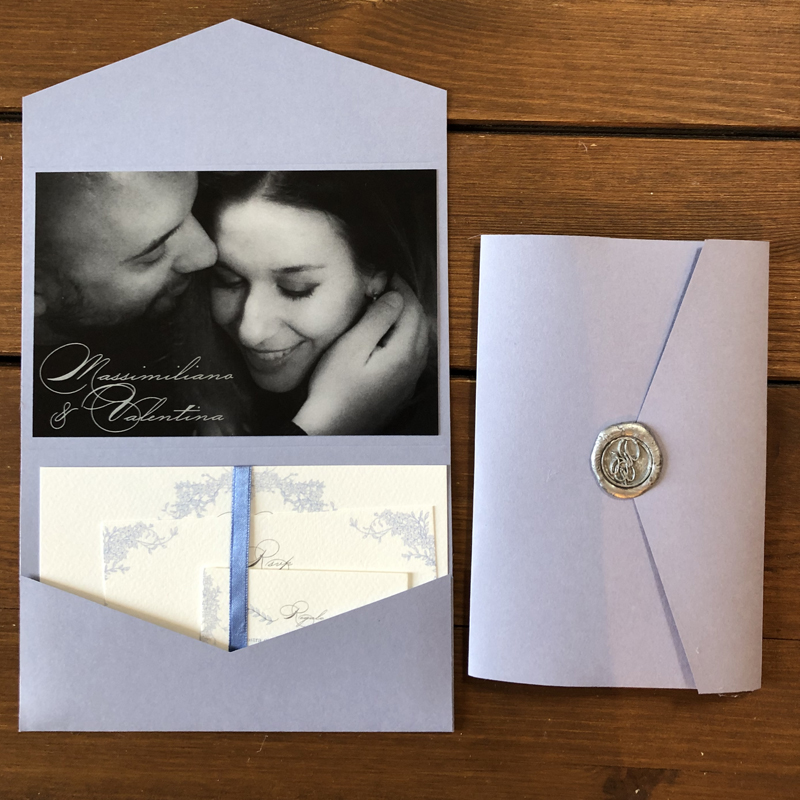 Le partecipazioni nozze con pocketfold possono essere abbinate a molti matrimoni, queste buste con tasche sono molto originali e dispobili in molti colori. Le buste sono disponibili sia in forma rettangolare che in formato quadrato. Nel formato rettangolare la tasca può essere nel lato corto o nel lato lungo del pocketfolf influenzando la lettura dell’invito. Queste partecipazioni possono essere chiuse con ceralacca o con una fascetta o con un nastro tutto verrà lasciato alla vostra fantasia. In questa offerta sono compresi solo due biglietti.